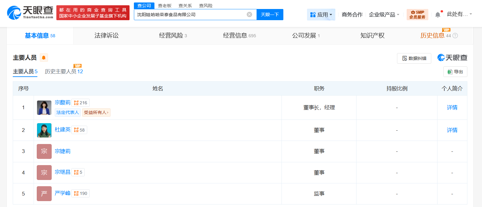 值得注意的是,宗馥莉、宗婕莉、宗继昌、杜建英共同关联沈阳娃哈哈荣泰食品有限公司,该公司成立于2007年2月,法定代表人为宗馥莉,注册资本1500万美元,经营范围为食品生产、乳制品生产、食品用塑料包装容器工具制品生产等,由荣泰企业有限公司(英属维尔京群岛)、浙江启力投资有限公司共同持股。主要人员信息显示,宗馥莉任该公司董事长、经理,杜建英、宗婕莉、宗继昌均为董事。