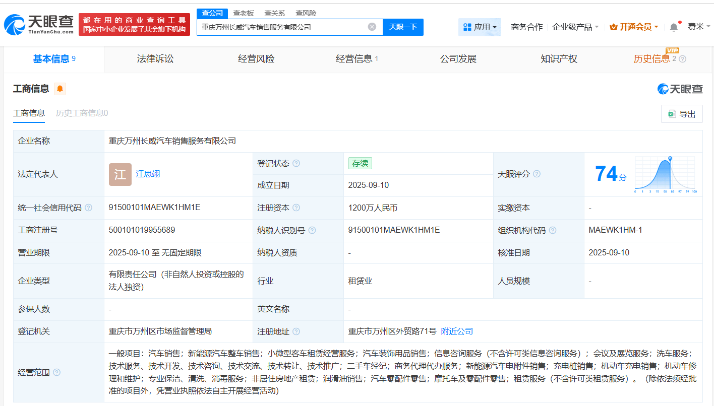 天眼查工商信息显示,近日,重庆万州长威汽车销售服务有限公司成立,法定代表人为江思翊,注册资本1000万人民币,经营范围包括汽车销售、新能源汽车整车销售、小微型客车租赁经营服务等。