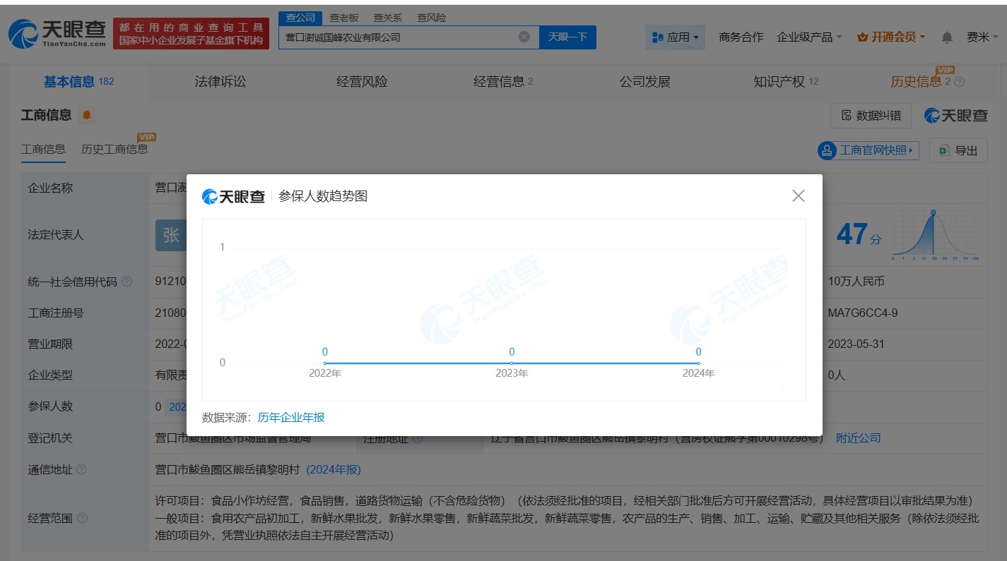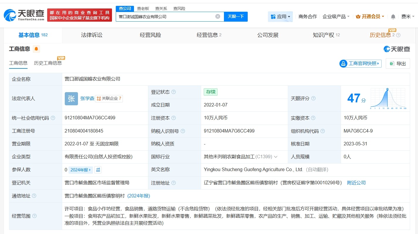 天眼查App显示,营口澍诚国峰农业有限公司成立于2022年1月,法定代表人为张学森,注册资本10万人民币,经营范围包括食品小作坊经营、食品销售、道路货物运输等,由张学森、张学霖共同持股。年报信息显示,该公司连续多年参保人数为0。