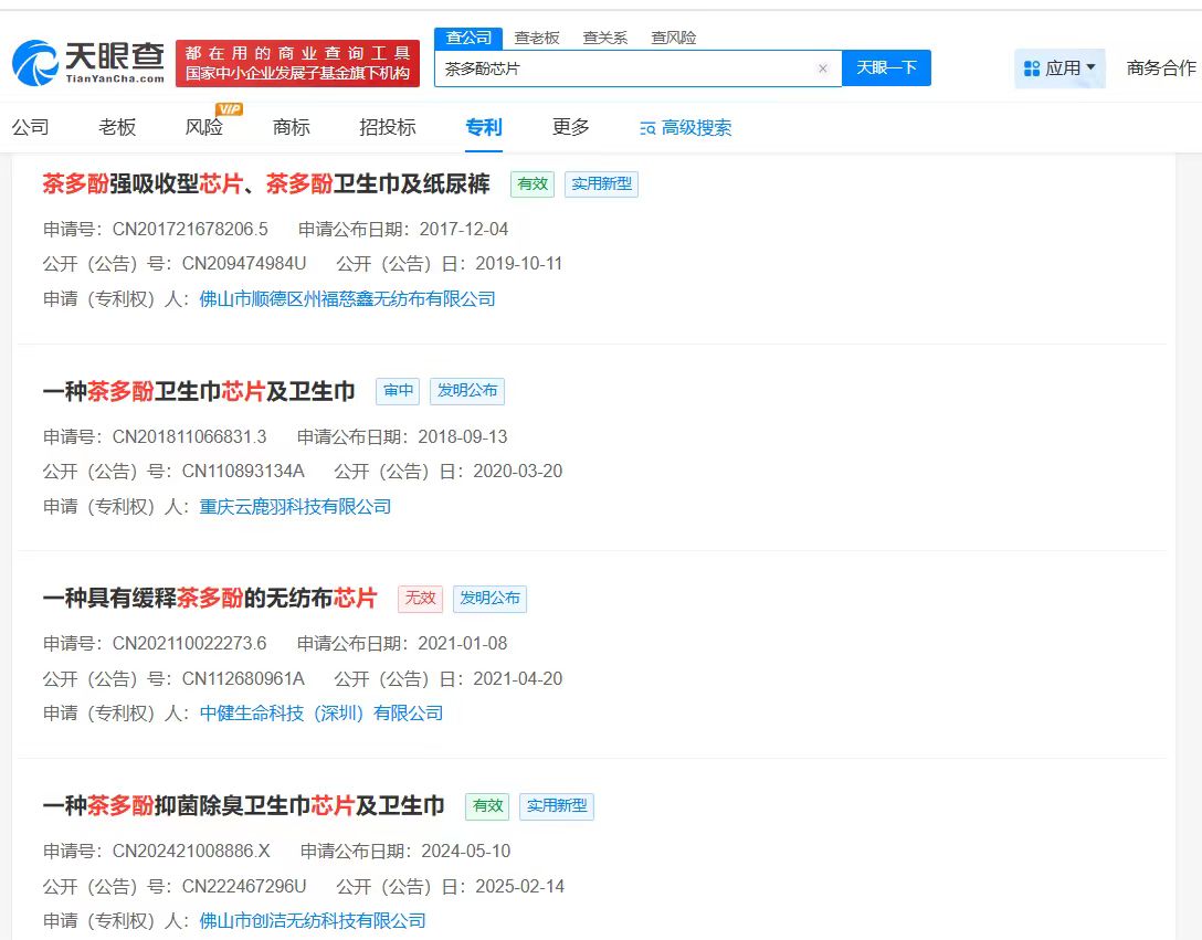 天眼查知识产权信息显示,我国目前有10余件茶多酚芯片相关专利,包括“一种茶多酚卫生巾芯片及卫生巾”“一种茶多酚卫生巾芯片及卫生巾”等。申请人为广东某实业股份有限公司、重庆某科技公司、佛山某科技公司等。