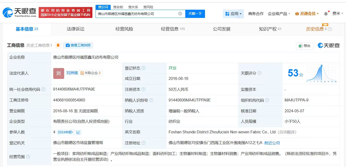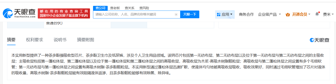 天眼查App显示,上述专利关联公司佛山市顺德区州福慈鑫无纺布有限公司成立于2016年8月,法定代表人为刘洲福,注册资本50万人民币,经营范围包括家用纺织制成品制造、产业用纺织制成品制造、面料纺织加工等,由刘慈雄、刘洲福共同持股。知识产权信息显示,该公司2017年申请的“茶多酚强吸收型芯片、茶多酚卫生巾及纸尿裤”专利于2019年获授权。摘要显示,该实用新型专利涉及个人卫生用品领域,通过蓬松体层迅速扩散,使液体均匀地被高吸收层吸收,吸收效果好,同时通过毛细软管增加了芯片对液体的吸收量,高吸水树脂-茶多酚颗粒层能有效阻隔液体返渗,且茶多酚颗粒能够有效除菌、除异味。