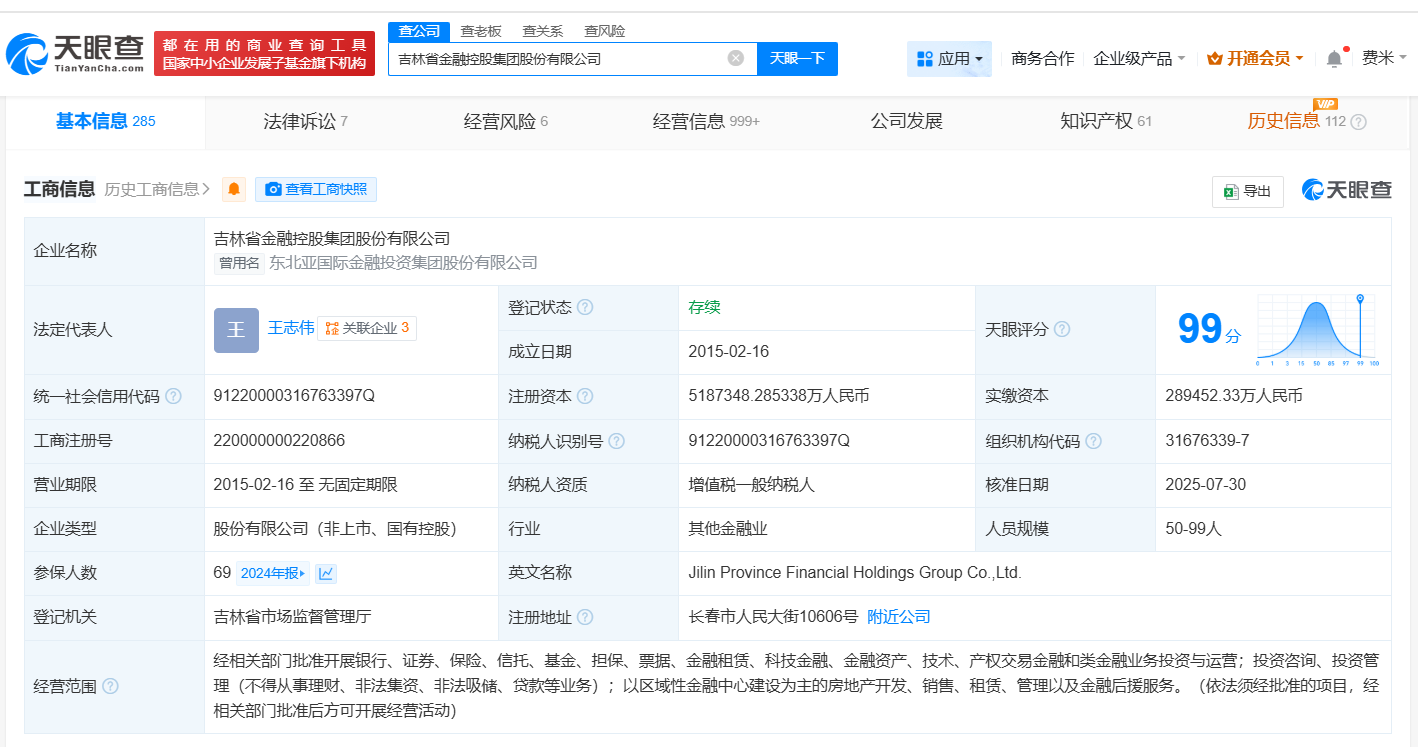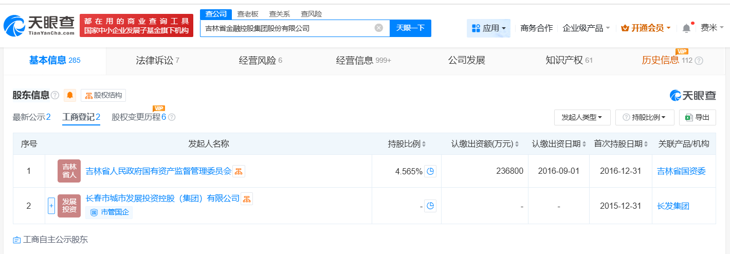 天眼查App显示,近日,吉林省金融控股集团股份有限公司发生工商变更,注册资本由约172.7亿增至约518.7亿人民币,增幅约200%。
