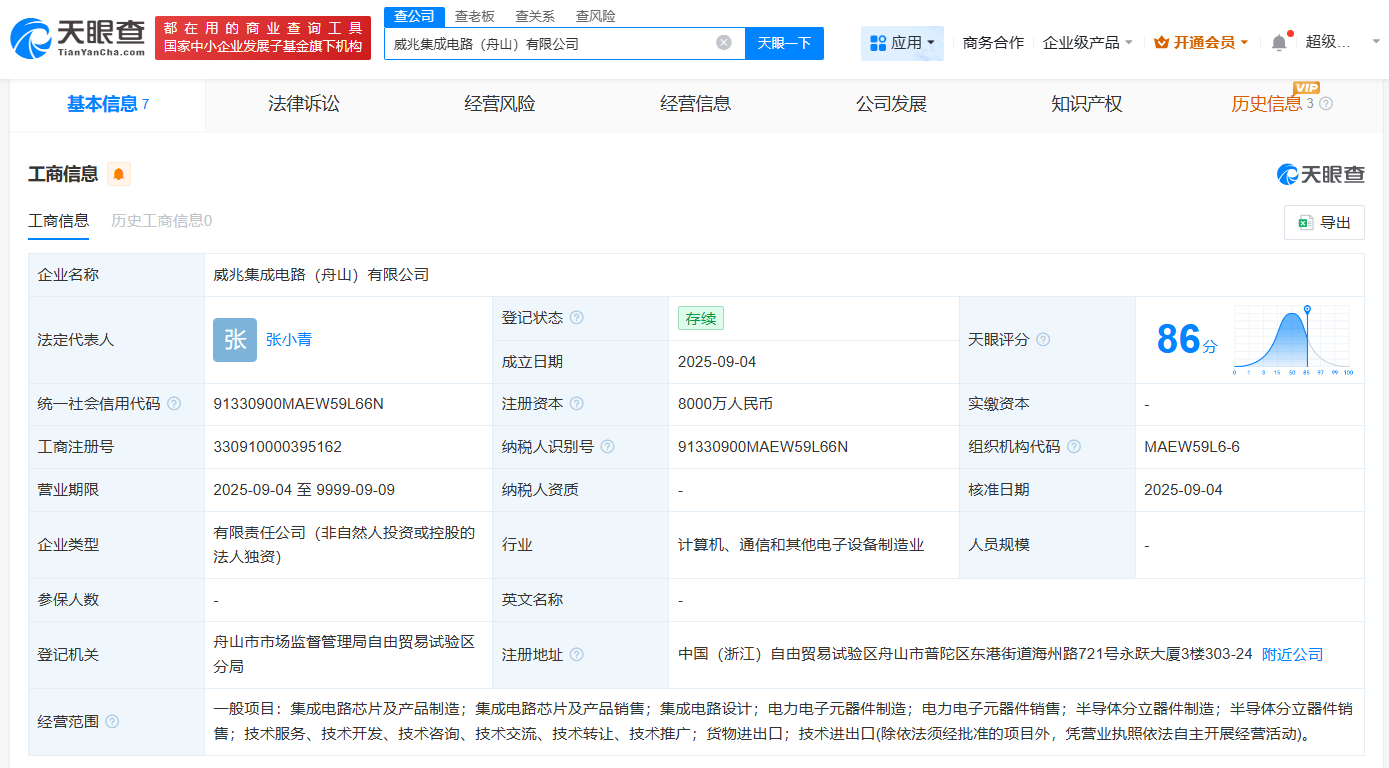 近日,威兆集成电路(舟山)有限公司成立,法定代表人为张小青,注册资本8000万人民币,经营范围包括集成电路芯片及产品制造、集成电路芯片及产品销售、集成电路设计等。