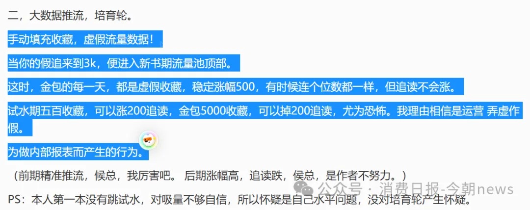他提到,作品来到新书期流量池顶部后,只涨收藏,不涨追读,称“金包的每一天,都是虚假收藏,稳定涨幅500,有时候连个位数都一样,但追读不会涨。试水期五百收藏,可以涨200追读,金包5000收藏,可以掉200追读”。