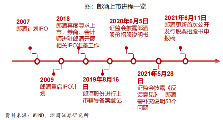 2020年5月28日,郎酒正式向中国证监会递交IPO招股书,但在2020年7月10日,其保荐机构广发证券因违规行为被证监会处以暂停保荐机构资格6个月、暂不受理债券承销业务12个月的监管处罚。在去年6月11日郎酒股份更新首次公开发行股票招股书申报稿,上市进程再次开启,结果被证监会53连问堵在门外。
