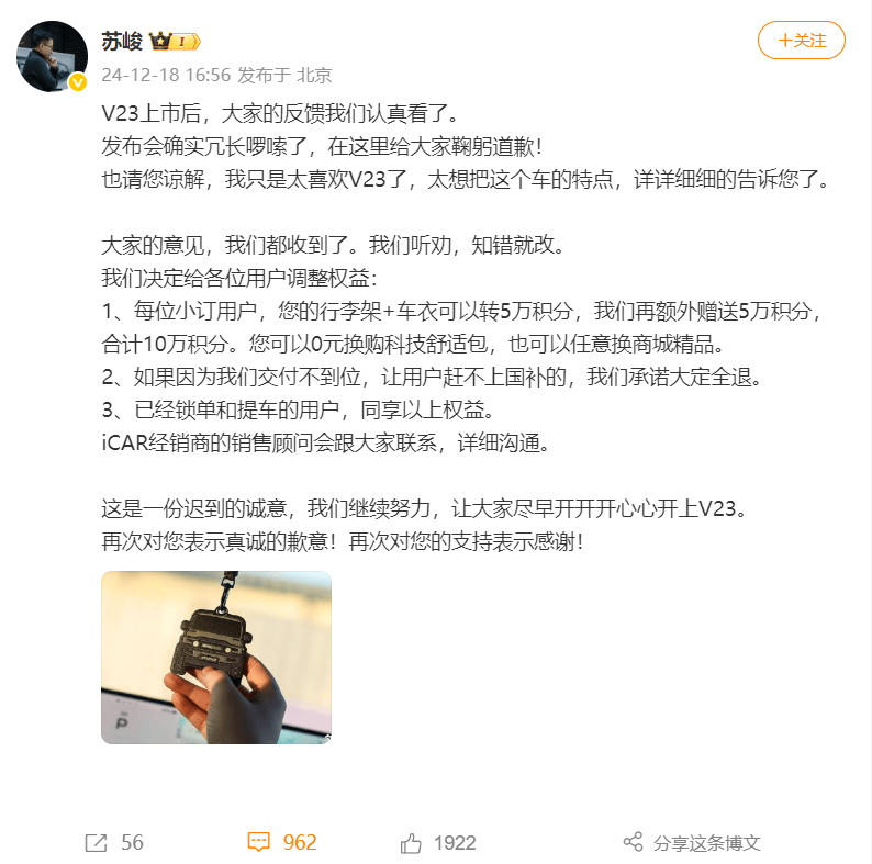 面对市场的强烈反响,苏峻虽迅速在社交平台上道歉,并给出了积分补偿的补救措施,但这一切似乎都未能挽回消费者的心。从目前的市场表现来看,iCAR V23的“慢热长红”之说,更像是一个遥不可及的梦想。