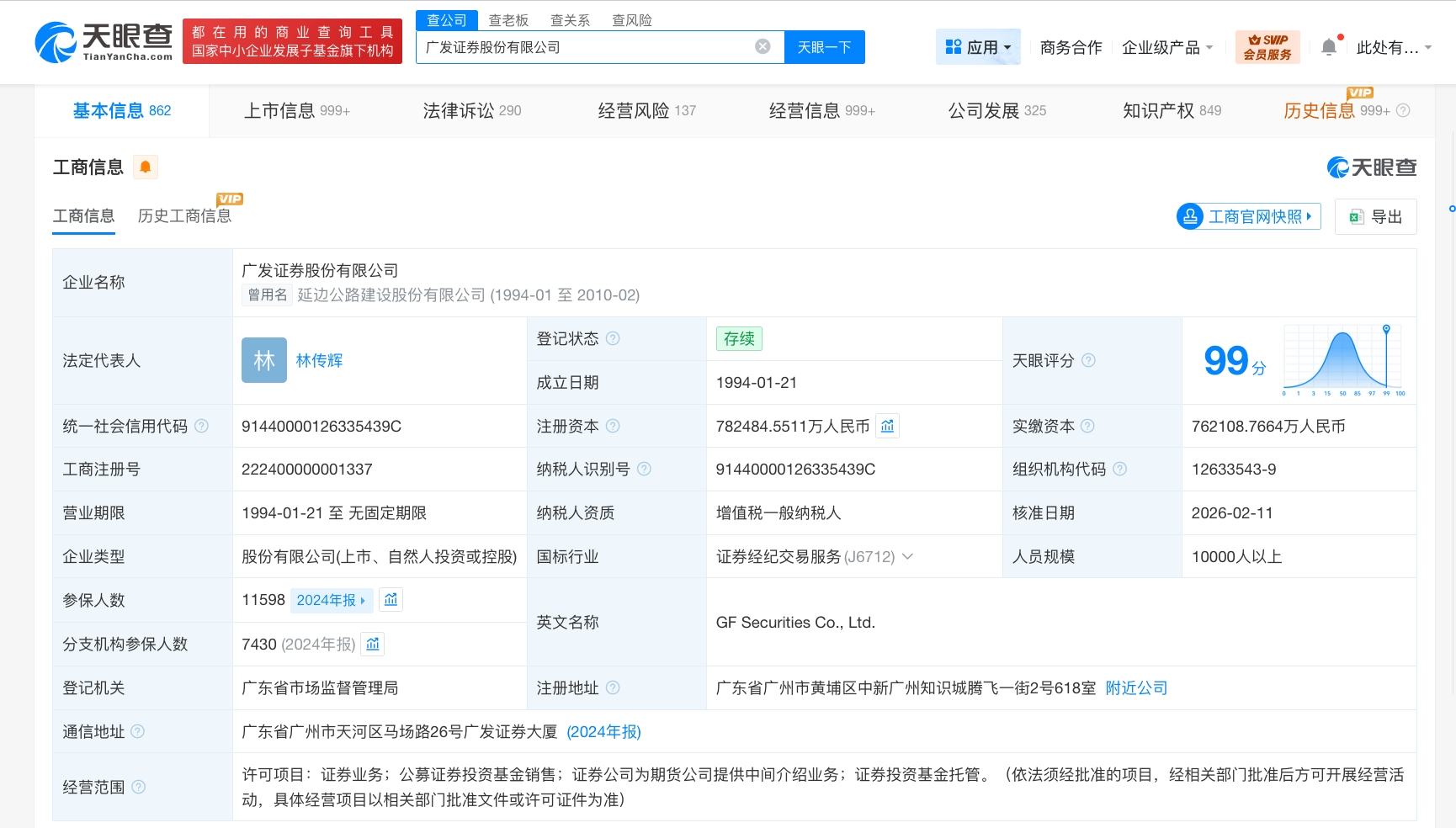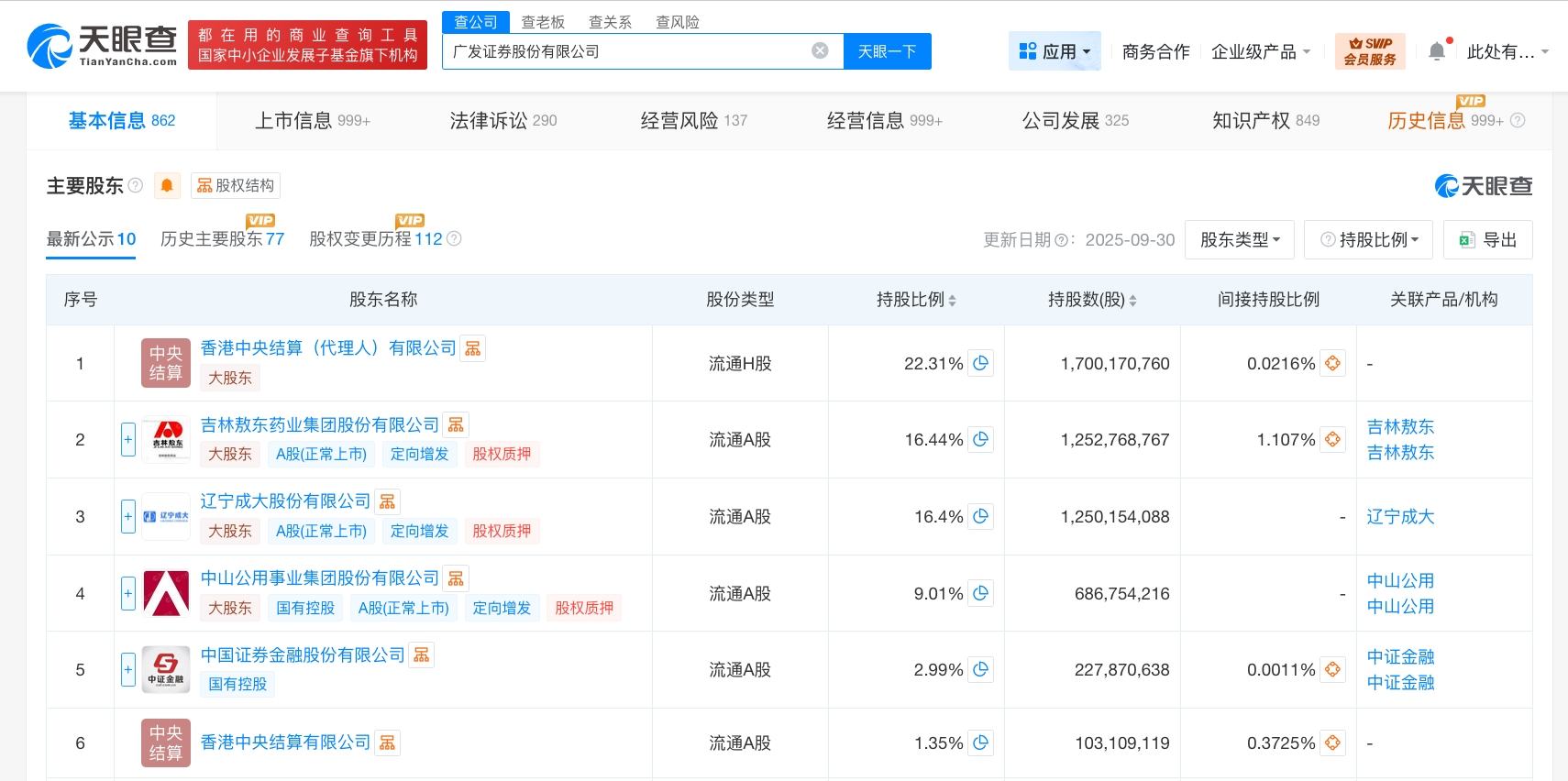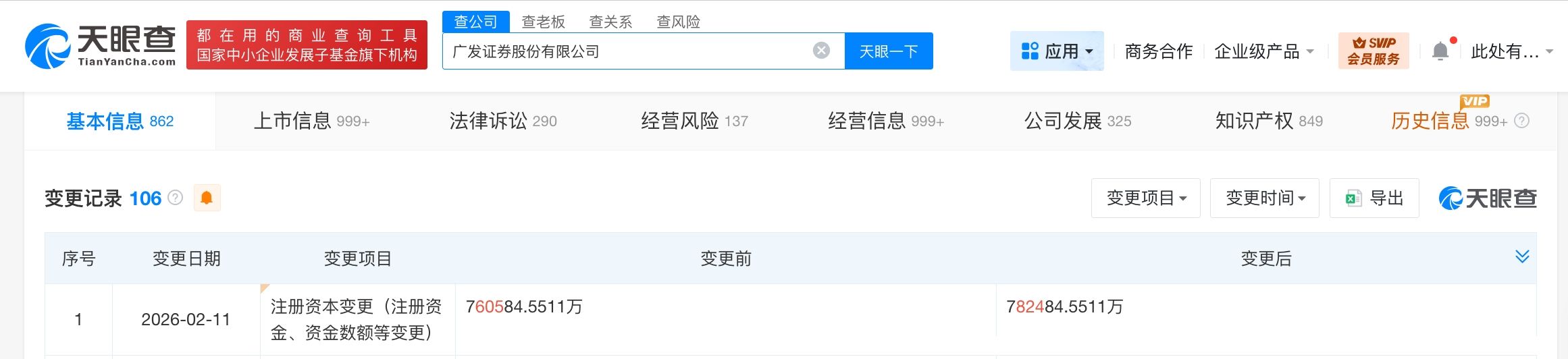 天眼查App显示,近日,广发证券(000776)发生工商变更,注册资本由约76.06亿人民币增至约78.25亿人民币,增幅约3%。