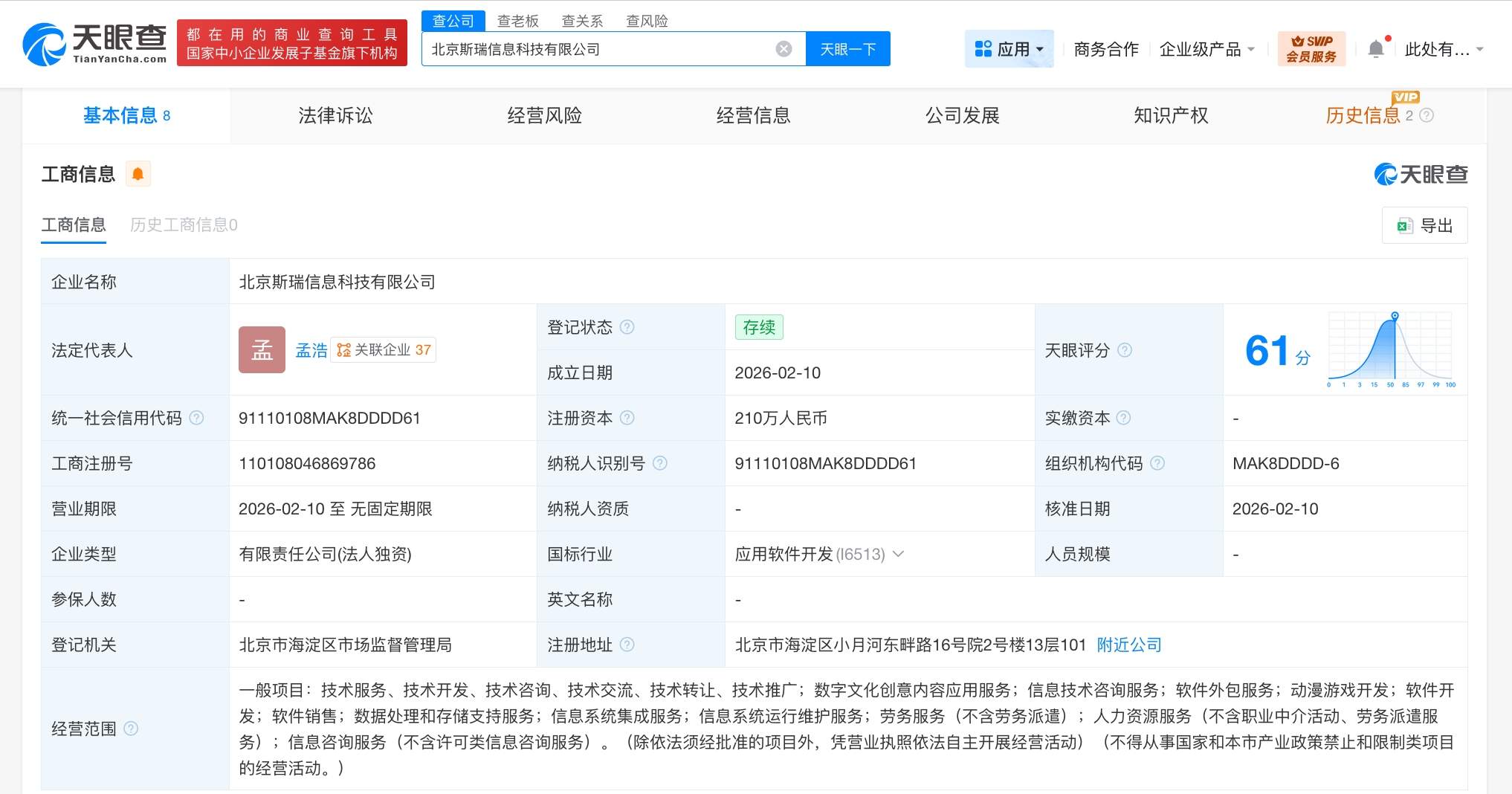 天眼查App显示,近日,北京斯瑞信息科技有限公司成立,法定代表人为孟浩,注册资本210万人民币,经营范围含数字文化创意内容应用服务、信息技术咨询服务、软件外包服务、动漫游戏开发、数据处理和存储支持服务、信息系统集成服务、信息系统运行维护服务、信息咨询服务等,由东软集团旗下上海思芮信息科技有限公司全资持股。