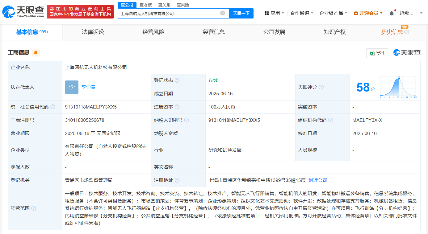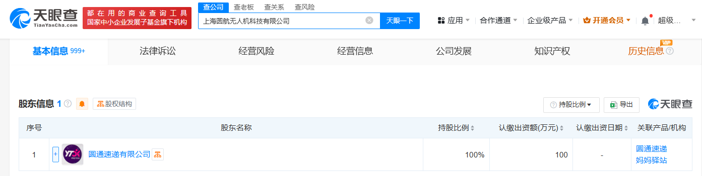 天眼查App显示,近日,上海圆航无人机科技有限公司成立,法定代表人为李恒贵,注册资本100万人民币,经营范围包括智能无人飞行器销售、智能机器人的研发、智能物料搬运装备销售等。股东信息显示,该公司由圆通速递有限公司全资持股。