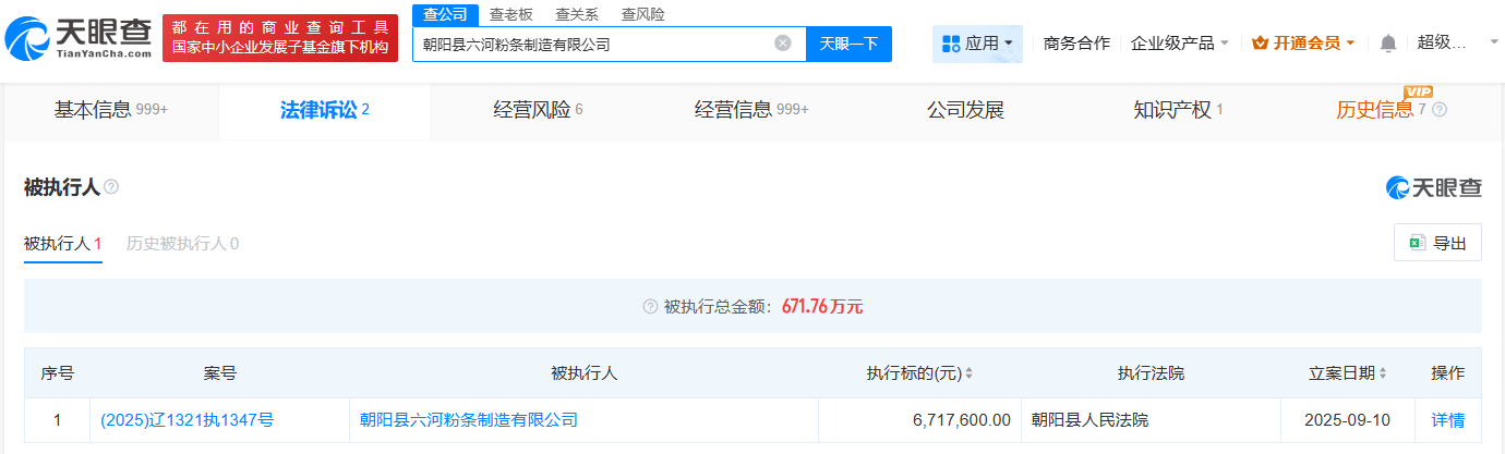 天眼查天眼风险信息显示,近日,朝阳县六河粉条制造有限公司新增1条被执行人信息,执行标的671万余元,执行法院为朝阳县人民法院。