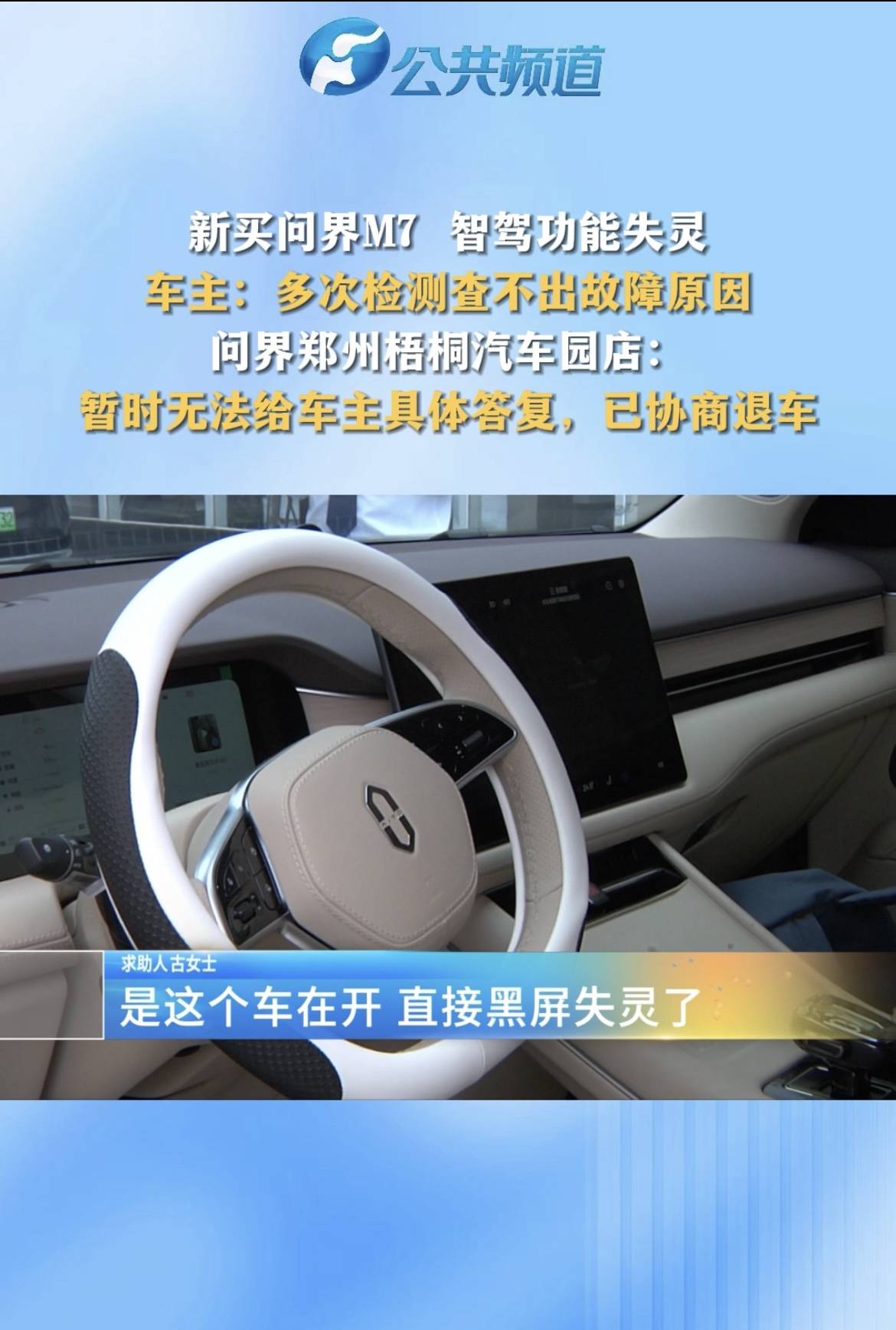 近日,河南广播电视台公共频道《百姓315》报道,河南一名女子花费30多万购买了一辆问界M7新能源汽车,10天后车辆智驾系统瘫痪,厂家经过一系列检查后竟然没有查出问题,最后,在消费者的强烈要求下不得不全额退车。