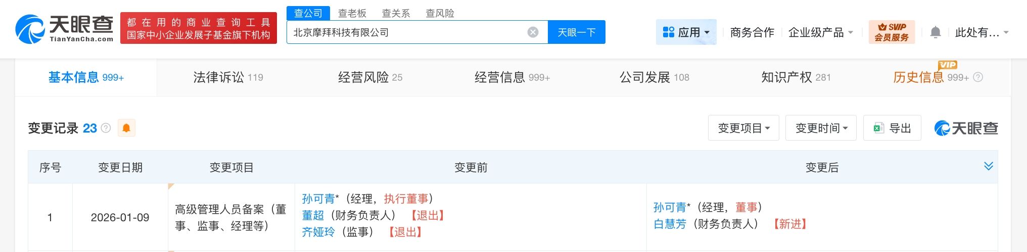 天眼查工商信息显示,摩拜单车关联公司北京摩拜科技有限公司发生工商变更,孙可青由执行董事、经理变更为经理、董事,同时,齐娅玲卸任监事,董超卸任财务负责人,新增白慧芳为财务负责人。