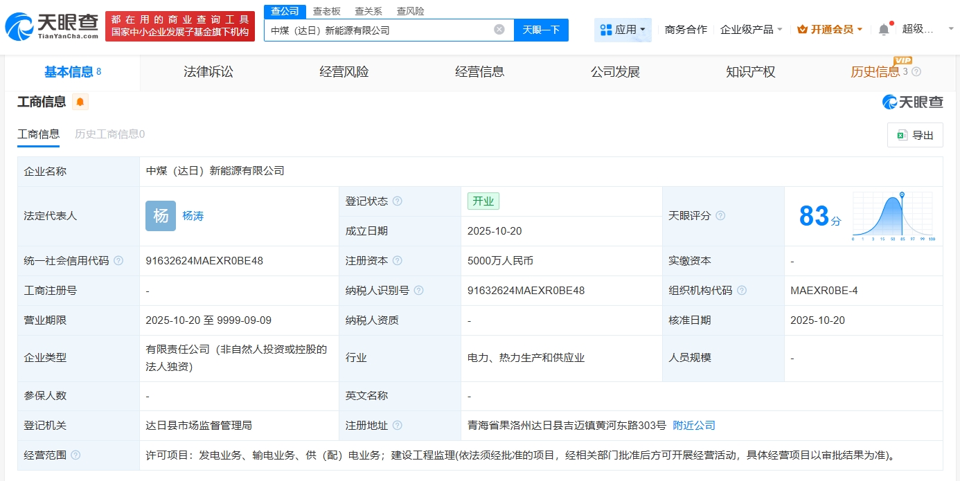天眼查App显示,近日,中煤(达日)新能源有限公司成立,法定代表人为杨涛,注册资本5000万人民币,经营范围为发电业务、输电业务、供(配)电业务,建设工程监理。股东信息显示,该公司由中煤电力有限公司全资持股。