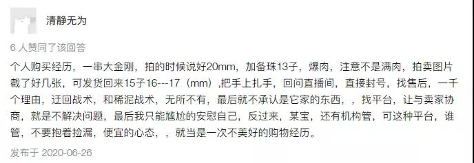 在知乎上,有名为“清静无为”的网友,分享其在文玩电商平台上购买文玩的经历:“个人购买经历,一串大金刚,拍的时候说好20mm,加备珠13子,爆肉,注意不是满肉,拍卖图片截了好几张,可发货回来15子16---17(mm),把手上扎手,回问直播间,直接封号,找售后,一千个理由,迂回战术,和稀泥战术,无所不有,最后就不承认是它家的东西,找平台,让与卖家协商,就是不解决问题,最后我只能尴尬的安慰自己,这种平台,谁管,不要抱着捡漏,便宜的心态,就当是一次不美好的购物经历。”