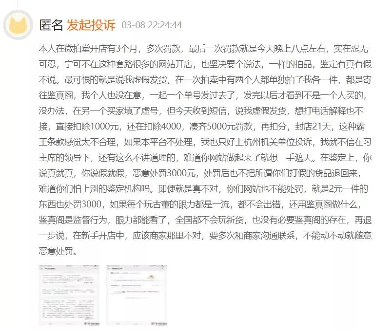 有卖家在黑猫投诉平台上投诉微拍堂,称微拍堂恶意罚款,其称自己在微拍堂开店有3个月,多次罚款,最可恨的就是被诬赖虚假发货,在一次拍卖中有两个人都单独拍了各一件,都是寄往鉴真阁,店主没在意,一起一个单号发过去了,发完以后才看到不是一个人买的,没办法,在另一个买家填了虚号,但收到短信,说店主虚假发货,想打电话解释也不接,直接扣除1000元,还在扣除4000,凑齐5000元罚款,再扣分,封店21天。在鉴定上,平台说真就真,平台说假就假,恶意处罚3000元,处罚后也不把所谓打假的货品退回来,再退一步说,在新手开店中,应该商家那里不对,要多次和商家沟通联系,不能动不动就随意恶意处罚。