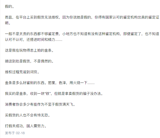 知乎上有关于“电商平台卖的文玩是真的假的?”的话题,底下有网友回复称展示自己在玩物得志上拍的金条,自己鉴别金条,密度,色泽,用火烧一下……网友通过鉴别,买的是金条,收到一块“铁”,但就是拿卖假货的骗子没办法。