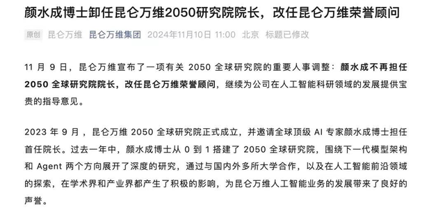 雪上加霜的是,仅在2023年9月加盟昆仑万维的AI学者颜水成,在财报披露不足半个月后便宣布离职,这距离他担任天工智能联席CEO不过14个月。颜水成是AI领域的顶尖人才,曾就职于微软亚研院并担任依图科技的首席技术官,他的突然离职无疑是对投资者信心的又一次打击。