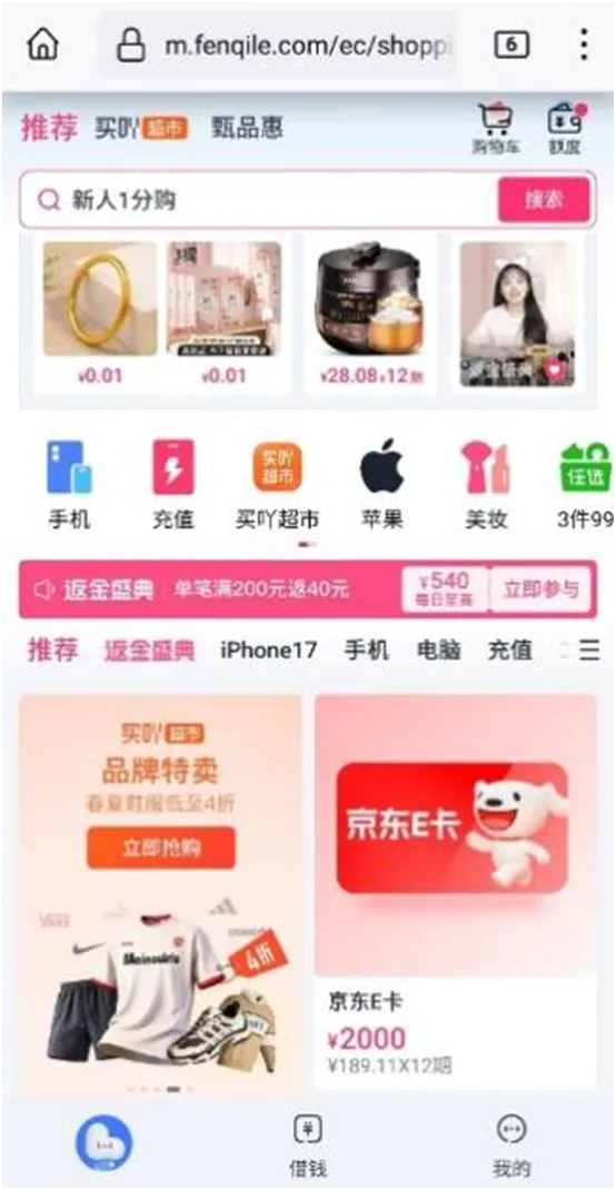 从产品与服务模式来看,分期乐将贷款服务深度嵌入电商消费场景,通过两类产品实现流量转化。在分期购物商城,用户在平台购买3C产品、奢侈品等商品时,可选择“0首付分期”,实际由持牌金融机构放款,平台收取服务费。例如用户购买2000元的京东E卡套餐,如果分12期,每期需要支付189.11元,即使不计算资金的时间价值,全年支付的金额为2269.32元。