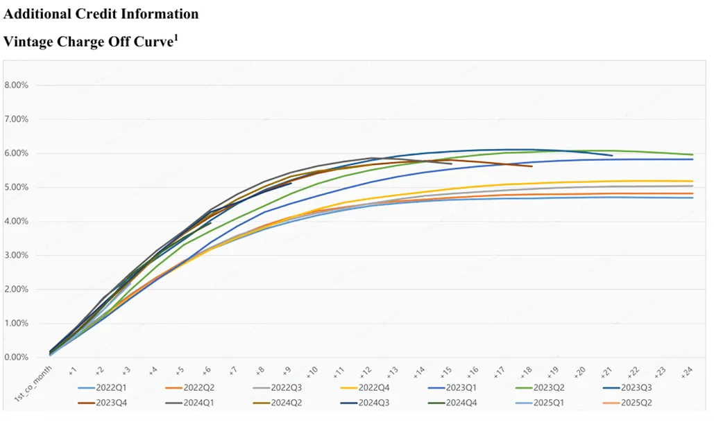 首先,在质量上,2025年第四季度风险指标出现恶化,后日的逾期率环比上升7%,90天以上的逾期率上升到3.1%,相比2025年第三季度是3.0%。Vintage Curve的斜率明显抬升,显示出公司在监管新规落地执行后面临风险压力,同时拨备覆盖率小幅回落到269%,相比2025年第三季度为270%。