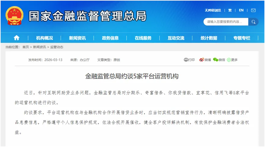 3月13日,金融监管总局发布消息称,针对互联网助贷业务问题,金融监管总局近期对分期乐、奇富借条、你我贷借款、宜享花、信用飞等5家平台的运营机构进行约谈。