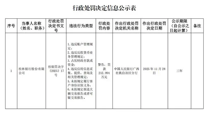 Wind数据显示,自2025年第三季度起,桂林银行被监管部门点名四次。比如:11月28日,桂林银行因为账户管理、反假币、信用信息管理、客户身份识别、大额可疑交易报告等方面存在六项违规行为而被中国人民银行广西分行处以212.994万元的罚款,同时对两名相关的员工也进行了处罚。