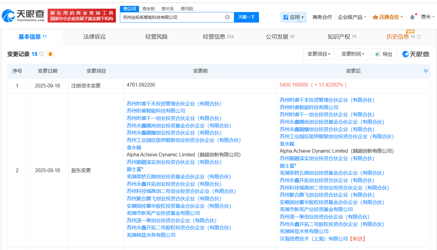 苏州坐标系智能科技有限公司成立于2023年8月,法定代表人为颜士富,经营范围包括人工智能应用软件开发、汽车零配件批发、电子产品销售等。股东信息显示,该公司现由苏州时睿智能科技有限公司、越超创新有限公司及上述新增股东等共同持股。公开资料显示,该公司专注于智能汽车线控底盘核心技术的研发与产业化。