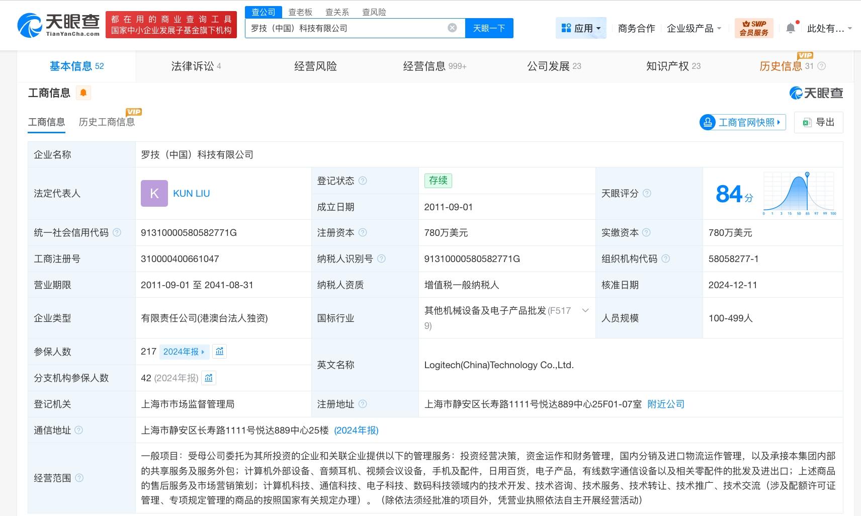 天眼查App显示,罗技(中国)科技有限公司成立于2011年9月,法定代表人为KUN LIU,注册资本780万美元,经营范围含投资经营决策,资金运作和财务管理,国内分销及进口物流运作管理,计算机外部设备、音频耳机、视频会议设备,手机及配件以及相关零配件的批发及进出口等,由LOGITECH HONG KONG LIMITED全资持股。风险信息显示,该公司涉及多起法律诉讼信息,案由涉及服务合同纠纷、产品责任纠纷等。