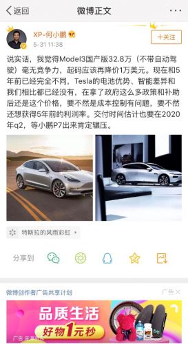 【TechWeb】5月31日,小鹏汽车董事长兼CEO何小鹏发布微博表示,认为国产特斯拉毫无竞争力,起码应该再降1万美元。