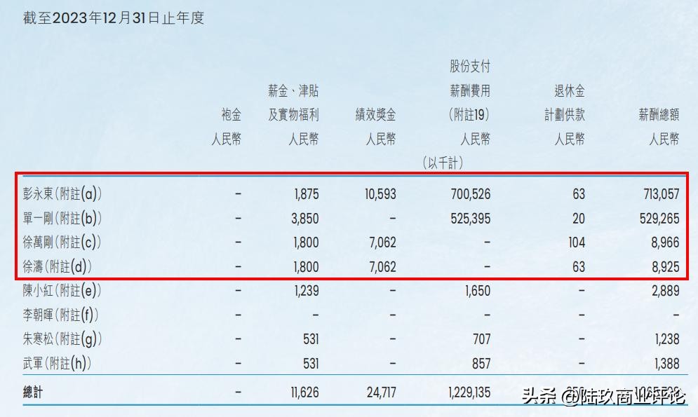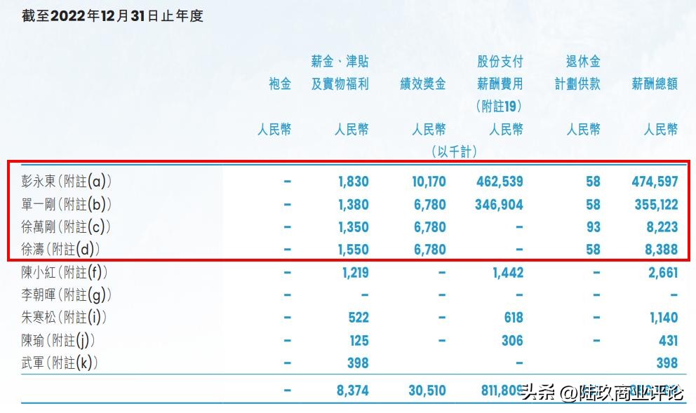 2022年,彭永东的薪酬为4.75亿元,单一刚的薪酬3.55亿元(22年起,这两位的包含股份支付,下同)徐万刚的薪酬为822.3万元,徐涛的薪酬为838.8万元。