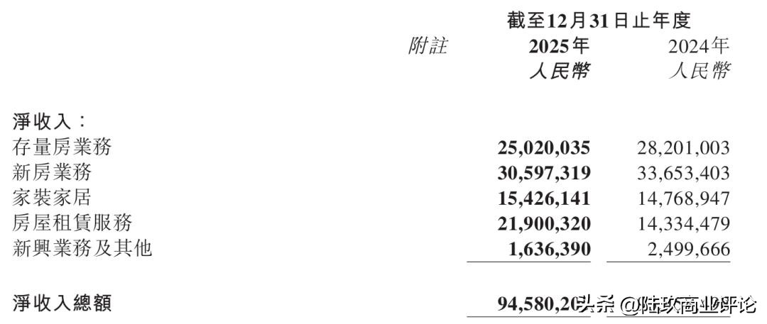 说回到贝壳的业务,去年,贝壳的核心交易业务压力不小,存量房业务净收入为250亿元,同比下降11.3%;新房业务净收入为306亿元,同比下降9.1%。二者贡献利润的降幅更为明显,分别同比下降19.29%和8.4%,所以公司整体毛利率从2024年的24.6%下滑至21.4%。