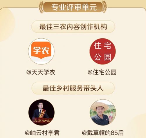 据悉,本届“金稻穗奖”设置了大众评审和专业评审两个单元,共12个奖项,包括7个人物奖、4个作品奖和1个机构奖。评审优选展现当代特色农村生活、推广农业技术、帮助农产品上行、对家乡发展有突出贡献等的参赛创作者和作品,进行评奖。获奖者将获得现金、流量、免费培训等奖励。