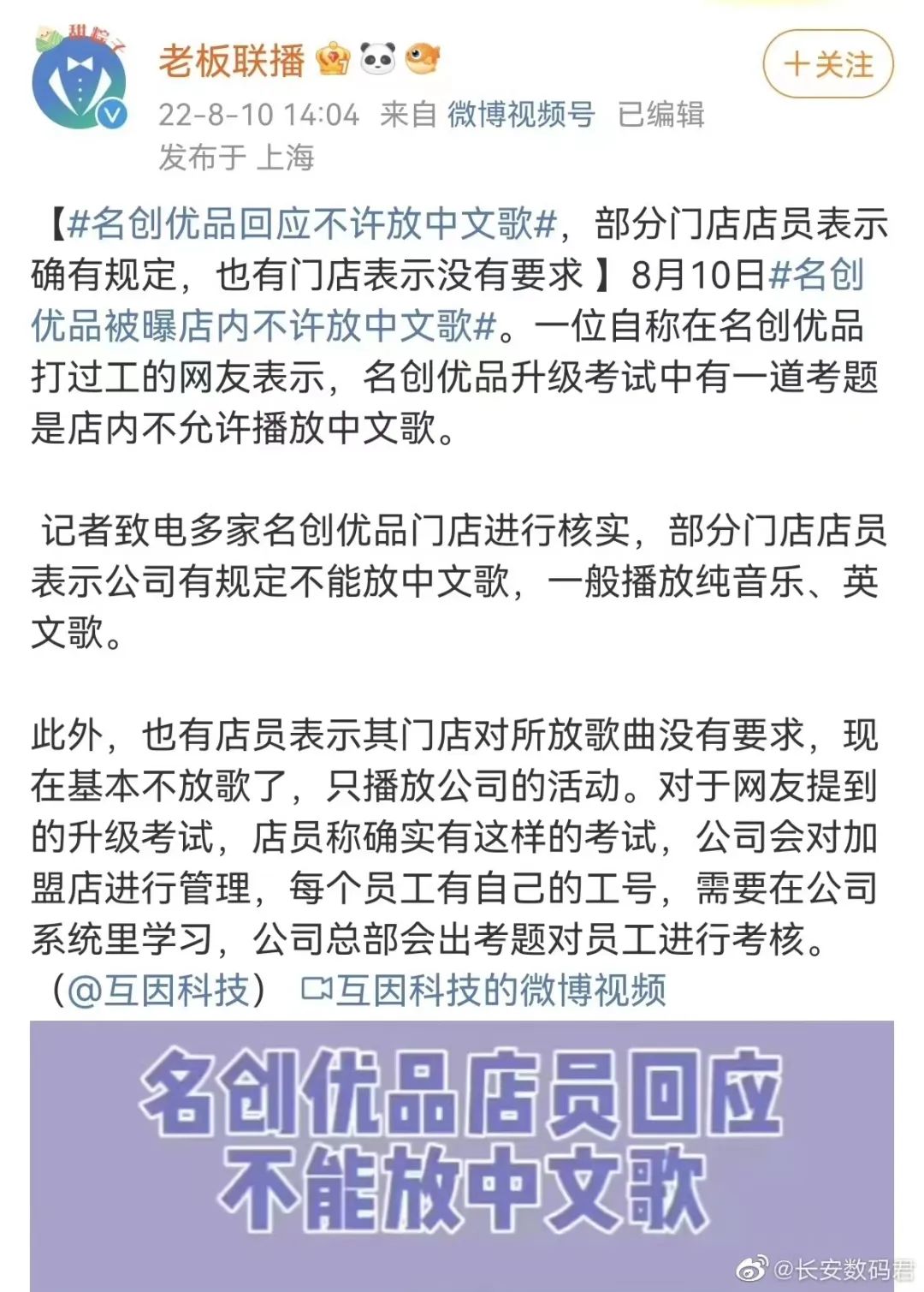 名创优品前员工曾爆料,名创优品升级考试中有一道考题是店内不允许播放中文歌。