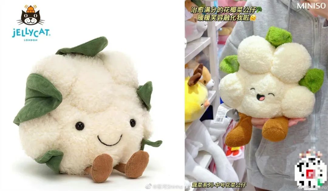 Jellycat大热单品花菜玩偶 VS名创优品的花椰菜公仔,形似神不似。