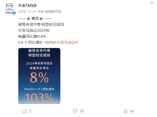 一边,长安马自达在官方网站和社交媒体上高调宣布,其2024年全年销量实现了同比增长8%的佳绩,CX-5车型更是实现了惊人的103%同比增长。这一消息似乎为长安马自达在电动化转型初期的努力注入了一剂强心针。然而,另一边,长安汽车作为长安马自达的中方最大股东,却公布了截然不同的数据。长安汽车发布的2024年12月产销快报显示,长安马自达全年累计销量仅为75637辆,同比下滑14.69%。这一数据与长安马自达官方公布的“同比增长8%”形成了鲜明的对比,也由此引发了“阴阳销量”的质疑。