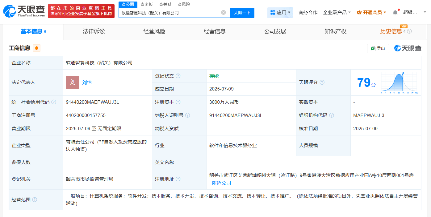 天眼查App显示,近日,软通智算科技(韶关)有限公司成立,法定代表人为刘怡,注册资本3000万人民币,经营范围包括计算机系统服务、软件开发等。