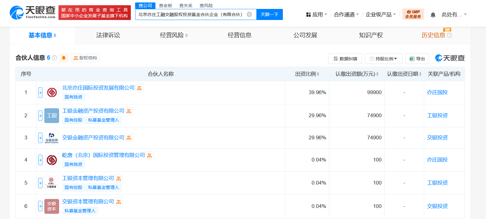 天眼查App显示,近日,北京亦庄工融交融股权投资基金合伙企业(有限合伙)成立,执行事务合伙人为交银资本管理有限公司,出资额25亿人民币,经营范围为以私募基金从事股权投资、投资管理、资产管理等活动。合伙人信息显示,该基金由北京亦庄国际投资发展有限公司、工银金融资产投资有限公司、交银金融资产投资有限公司等共同出资。