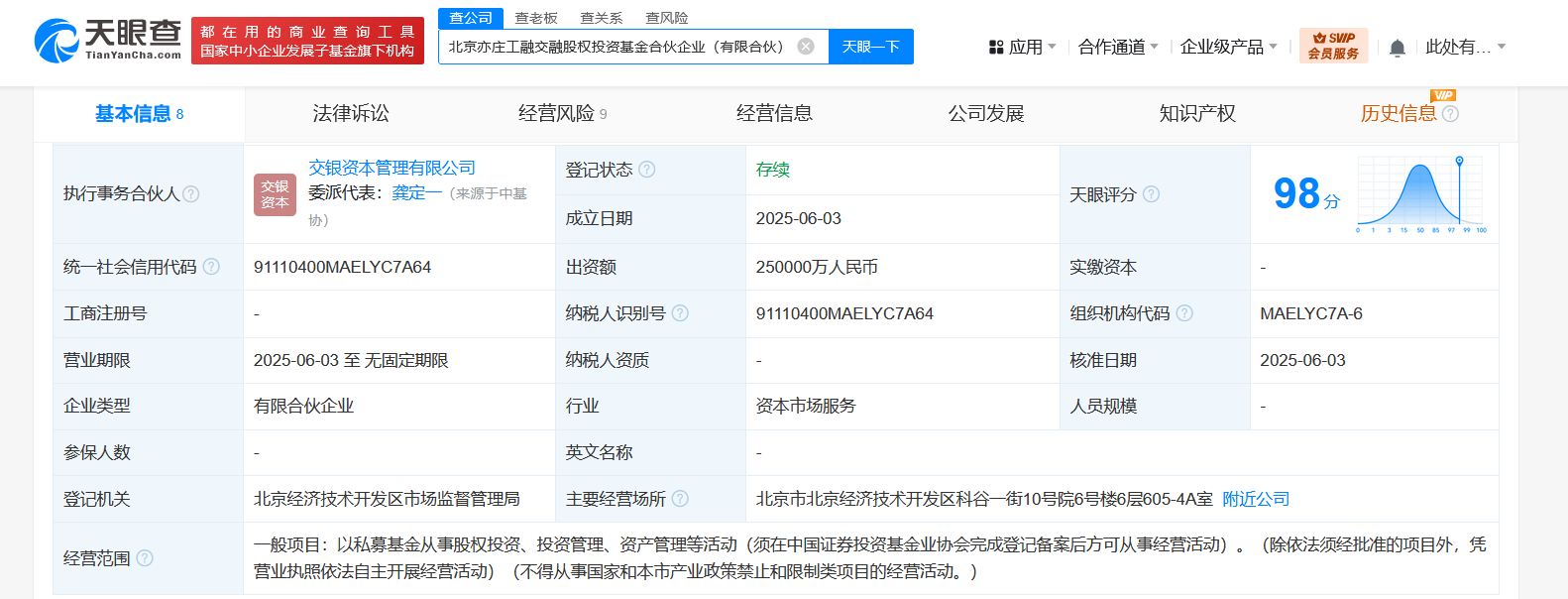 近日,北京亦庄工融交融股权投资基金合伙企业(有限合伙)成立,执行事务合伙人为交银资本管理有限公司,出资额25亿人民币,经营范围为以私募基金从事股权投资、投资管理、资产管理等活动。