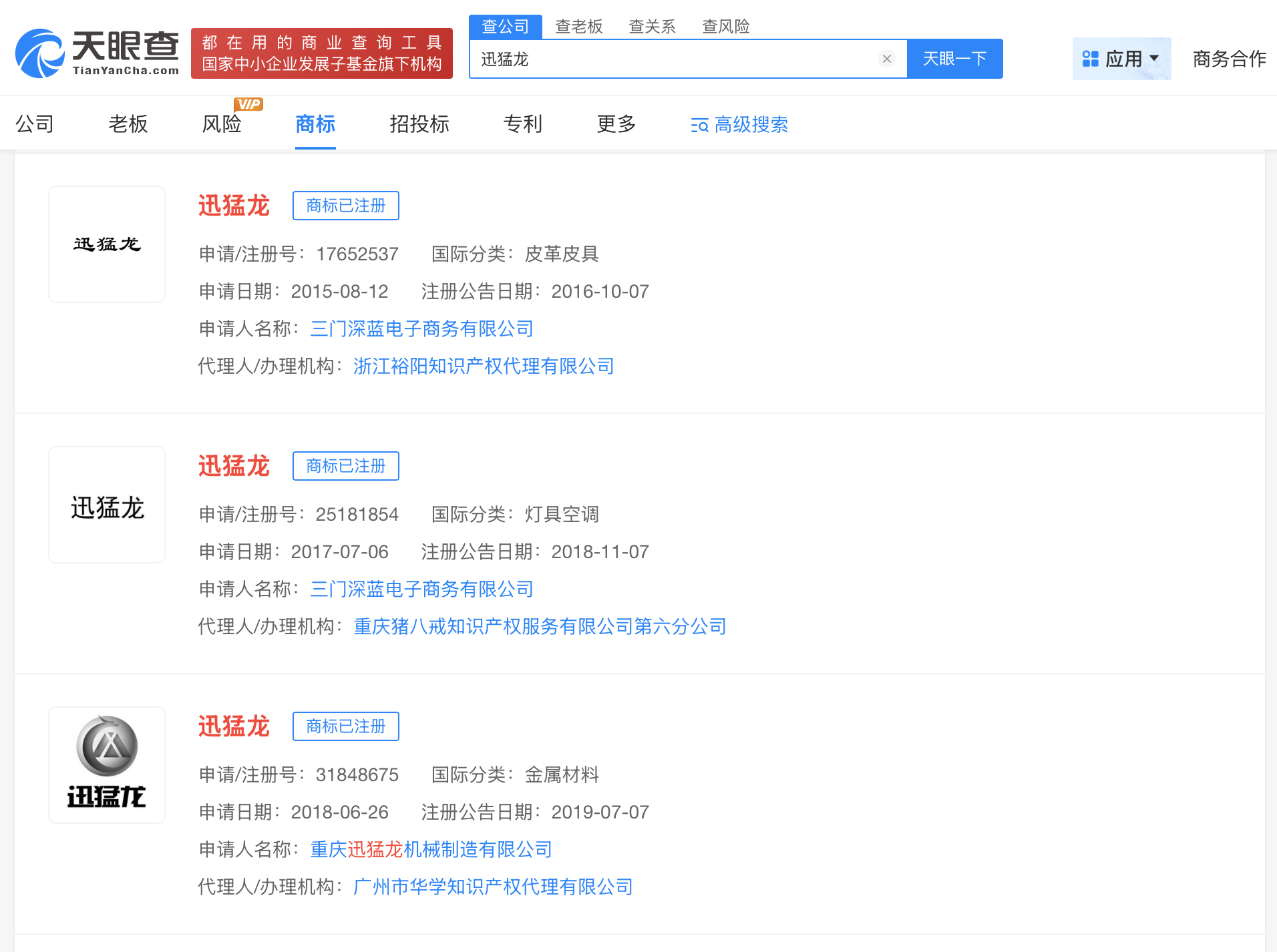 天眼查知识产权信息显示,“迅猛龙”已被多方申请注册为商标,申请人包括多家电子商务、贸易、文化、科技等公司及自然人,国际分类涉及皮革皮具、灯具空调、金属材料等,当前商标状态多为已注册。