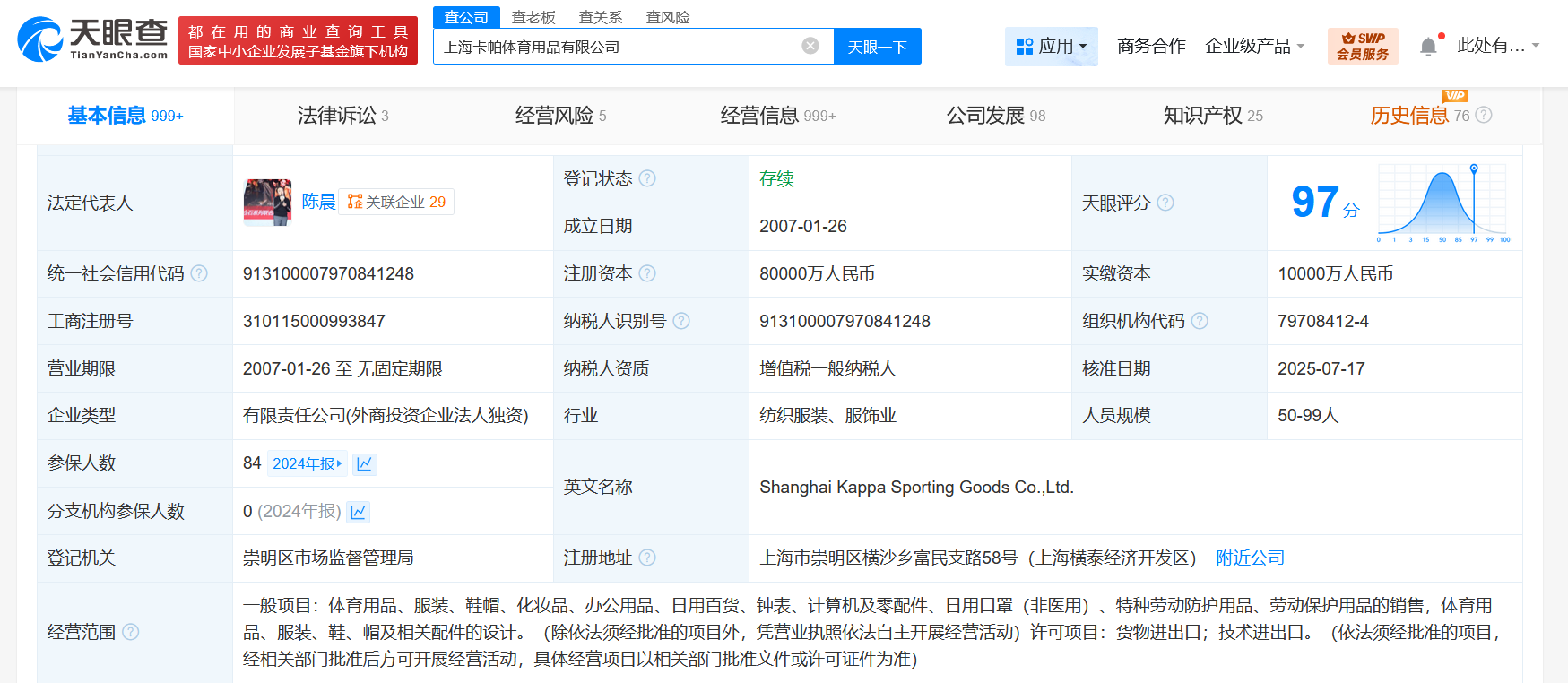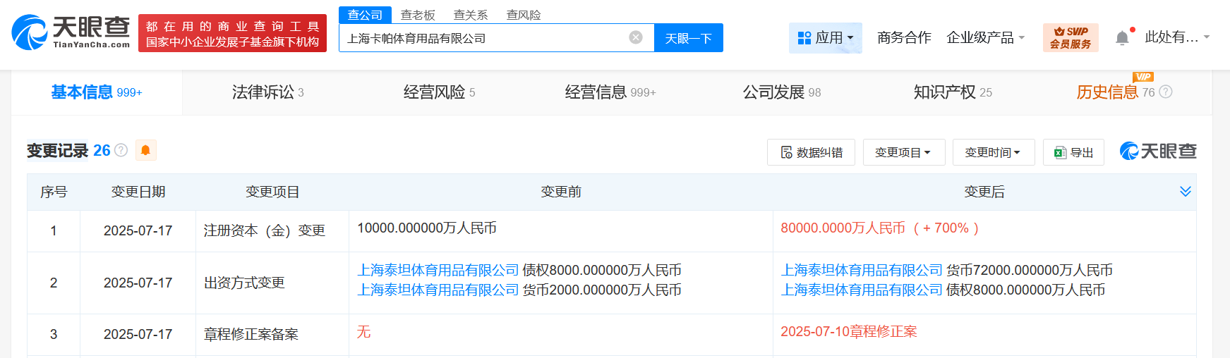 天眼查App显示,近日,Kappa中国关联公司上海卡帕体育用品有限公司发生工商变更,注册资本由1亿人民币增至8亿人民币,增幅700%。