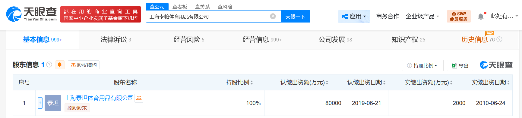 该公司成立于2007年1月,法定代表人为陈晨,经营范围含体育用品、服装、鞋帽等的销售,体育用品、服装、鞋、帽及相关配件的设计,货物进出口,技术进出口等。股东信息显示,该公司由上海泰坦体育用品有限公司全资持股。