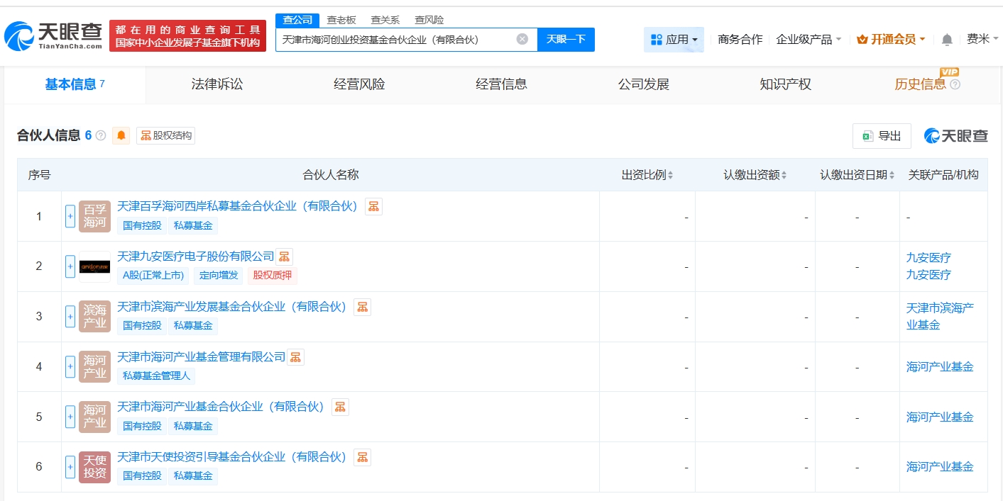天眼查工商信息显示,近日,天津市海河创业投资基金合伙企业(有限合伙)成立,执行事务合伙人为天津市海河产业基金管理有限公司,出资额7.01亿人民币,经营范围为以私募基金从事股权投资、投资管理、资产管理等活动,创业投资。合伙人信息显示,该基金由天津百孚海河西岸私募基金合伙企业(有限合伙)、天津市滨海产业发展基金合伙企业(有限合伙)、九安医疗(002432) 等共同出资。