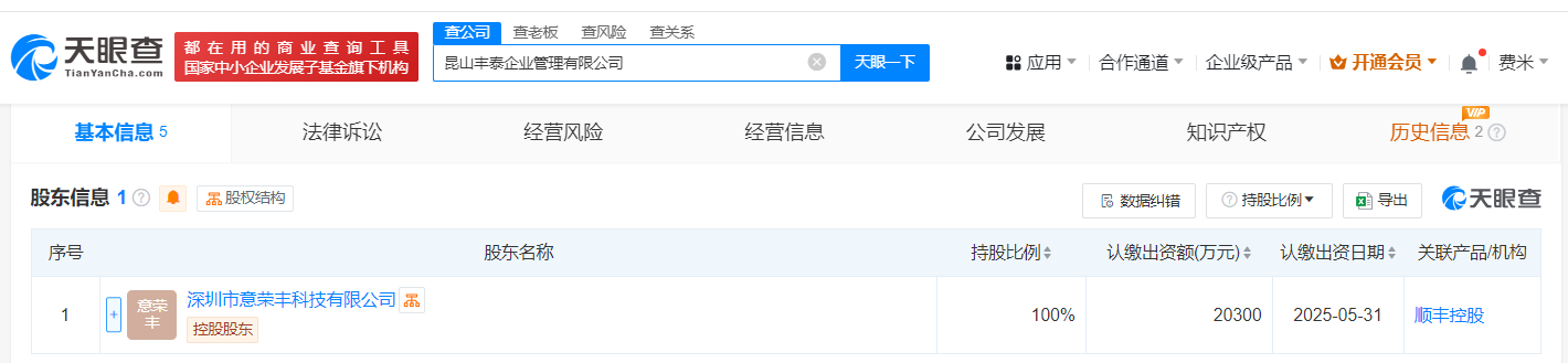 天眼查App显示,近日,昆山丰泰企业管理有限公司成立,法定代表人为孙炜,注册资本2.03亿人民币,经营范围包括企业管理咨询、园区管理服务、物业管理、非居住房地产租赁、住房租赁、普通货物仓储服务等,由顺丰控股(002352)旗下深圳市意荣丰科技有限公司全资持股。