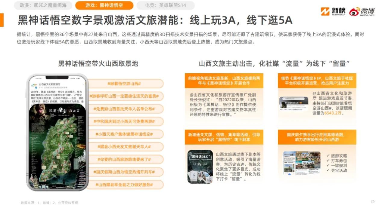 典型如《哪吒2》《黑神话:悟空》等案例,均通过平台完成从小圈热度到产业裂变的跨界传播。《黑神话》在微博首发后迅速登上热搜,@山西省文化和旅游厅跟进游戏宣发节奏,主持热门话题#跟着悟空游山西#,话题阅读量达6543.2万,收获海量关注。
