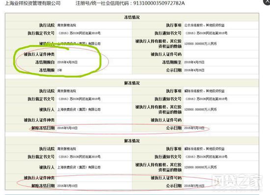 工商资料显示,业祥(上海业祥投资管理有限公司)于2016年4月26日起被南京鼓楼法院冻结12亿的股权和其他投资权益,但在2016年5月10日已解冻。
