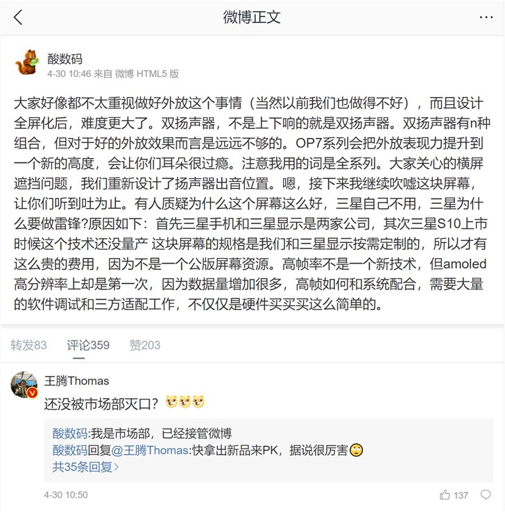 其表示,三星S10上市时并未搭载新技术的屏幕,这块屏幕规格是一加和三星显示按需定制的,所以才有这么贵的费用,因为不是一个公版屏幕资源。另外,高帧率不是一个新技术,但amoled高分辨率上却是第一次,因为数据量增加很多,高帧如何和系统配合,需要大量的软件调试和三方适配工作,不仅仅是硬件买买买这么简单的。