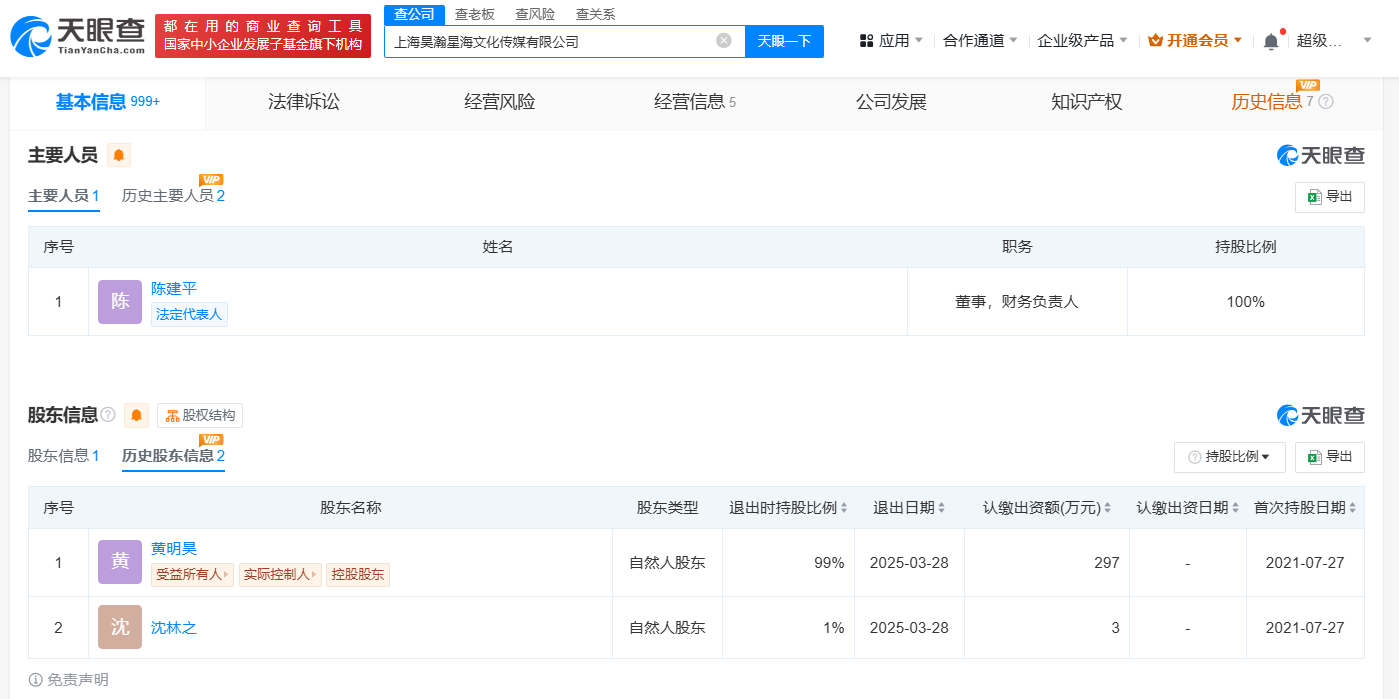 天眼查App显示,近日,上海昊瀚星海文化传媒有限公司发生工商变更,黄明昊退出该公司股东行列并卸任监事,同时沈林之也退出股东行列并卸任法定代表人,新增陈建平任法定代表人并全资持股。