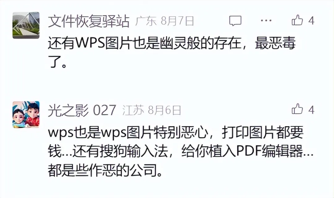 8月份值接Talk报道百度网盘默认安装看图插件的文章中,评论区很多网友都在吐槽金山软件的WPS产品。