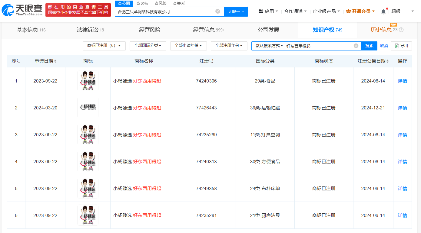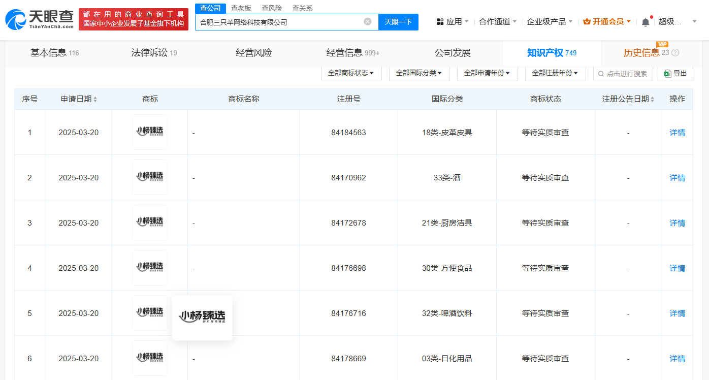 天眼查App显示,近日,合肥三只羊网络科技有限公司申请注册多枚“小杨臻选 好东西用得起”商标,国际分类涉及啤酒饮料、日化用品、方便食品等,当前商标状态均为等待实质审查。