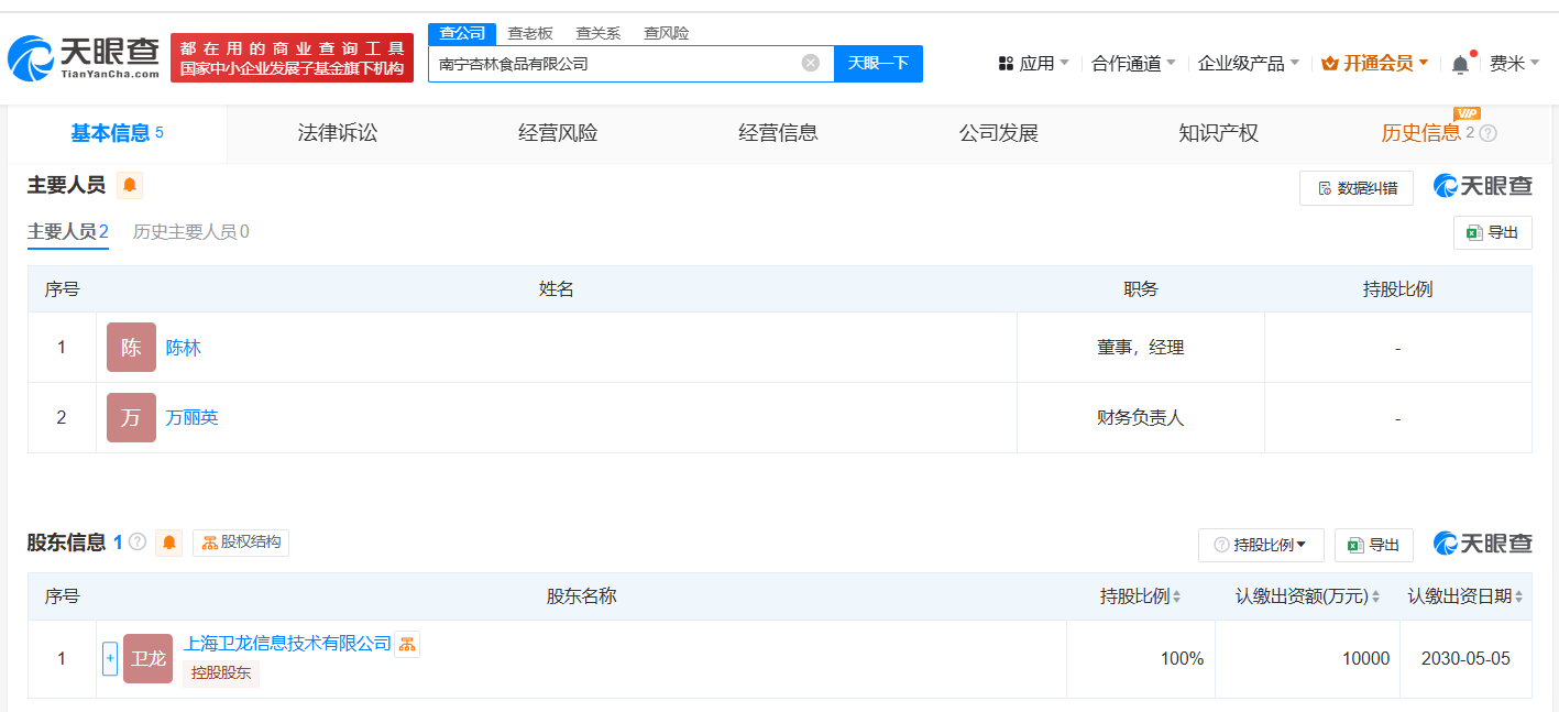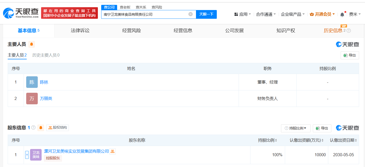 天眼查App显示,近日,南宁卫龙美味食品有限责任公司、南宁杏林食品有限公司成立,法定代表人均为陈林,注册资本均为1亿人民币,经营范围包括食品生产、食品销售、食品添加剂生产等。股东信息显示,上述两家公司分别由漯河卫龙美味实业发展集团有限公司、上海卫龙信息技术有限公司全资持股。
