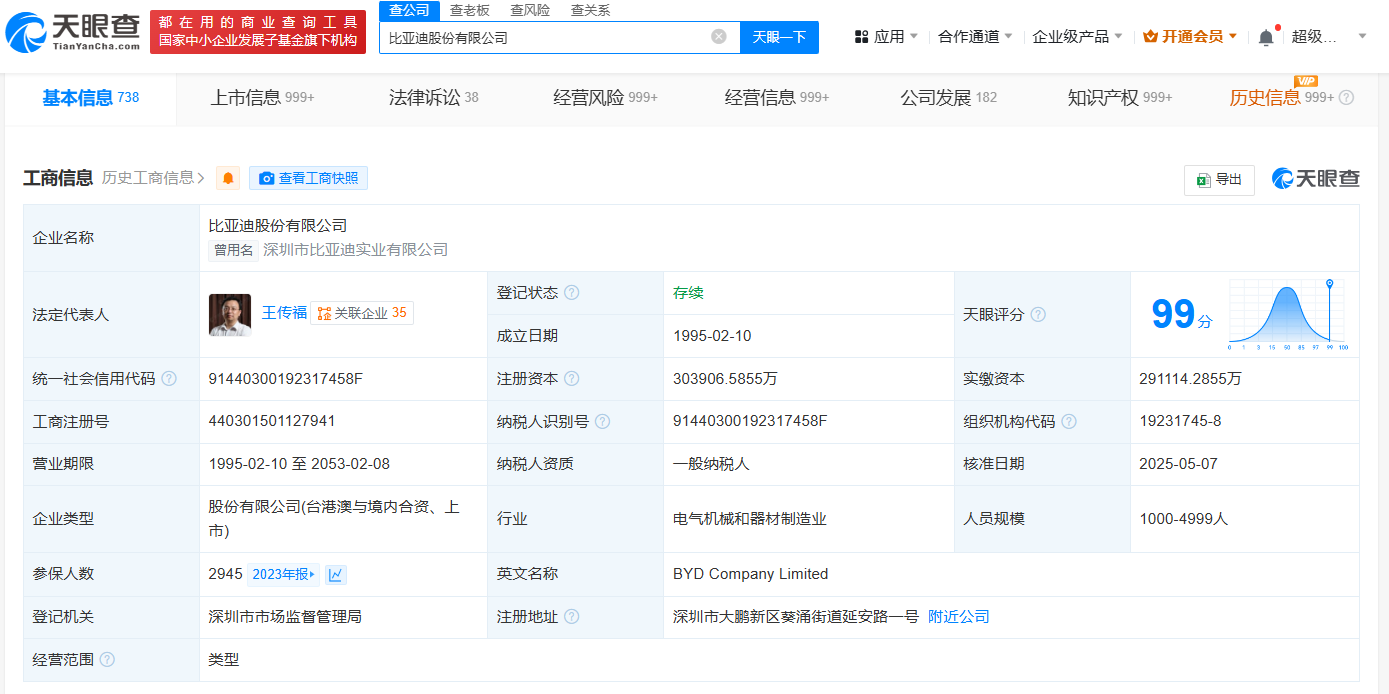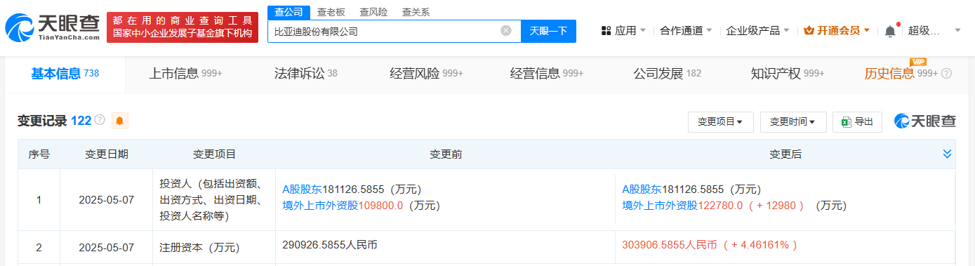 天眼查App显示,近日,比亚迪股份有限公司发生工商变更,注册资本由约29.09亿人民币增至约30.39亿人民币。